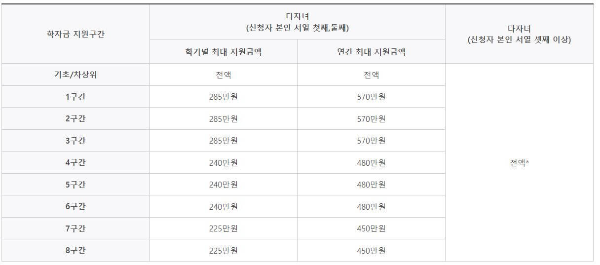- 대한민국 국적을 소지한 국내대학의 학자금 지원 8구간 이하, 다자녀 가정의 가구원인 대학생(미혼에 한정)