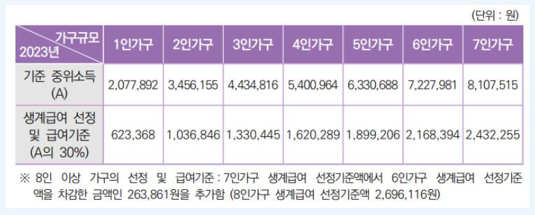 생계급여의 수급권자는 부양의무자가 없거나, 부양의무자가 있어도 부양능력이 없거나 부양을 받을 수 없는 사람으로서 가구의 소득인정액이 생계급여 선정기준 이하인 사람을 대상으로 지급하도록 되어 있습니다. 기초생활수급자 생계급여는 일상생활을 유지하기 어려운 이들을 대상으로 최소한의 비용을 지원해주는 것입니다. 생계급여를 받기 위해서는 소득 중위 32%에 해당되어야 하는데 1인기준 71만원, 2인기준 117만원 3인기준 150만원, 4인기준 183만원, 5인기준 214만원입니다.
