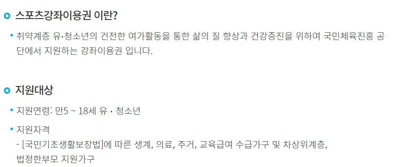 스포츠 바우처는 저소득층(만5세 ~ 18세)를 대상으로 여가활동과 건강한 스포츠 활용을 지원하는 제도입니다. 매월 최대 10만원까지 이용 가능한 이 강좌는 국민들의 올바른 여가활동과 다양한 체육시설 이용 기여를 목적으로 하고 있씁니다. 이를 통해서 대상 국민들은 보다 다양하고 다채로운 스포츠 프로그램을 배울 수 있습니다.